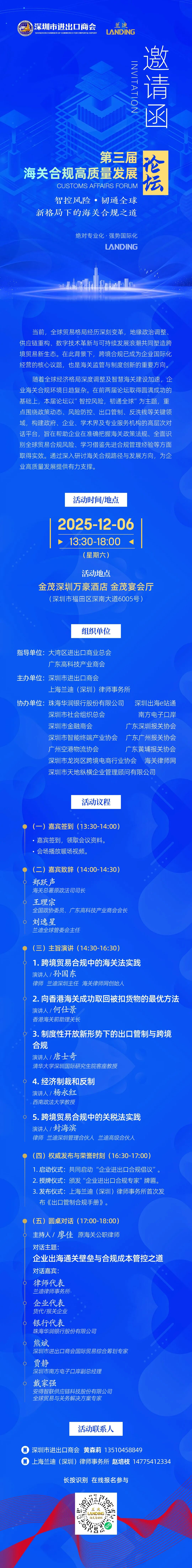 随着全球经济格局深度调整及智慧海关建设加速,企业海关合规环境日趋复杂。在前两届论坛取得圆满成功的基础上,本届论坛以"智控风险,韧通全球"为主题,重点围绕政策动态、风险防控、出口管制、反洗钱等关键领域,构建政府、企业、学术界及专业服务机构的高层次对话平台,旨在帮助企业在准确把握海关政策法规、全面识别全球贸易合规风险、学习借鉴先进合规管理经验等方面取得实效。通过深入研讨海关合规路径与发展方向,为企业高质量发展提供有力支撑。