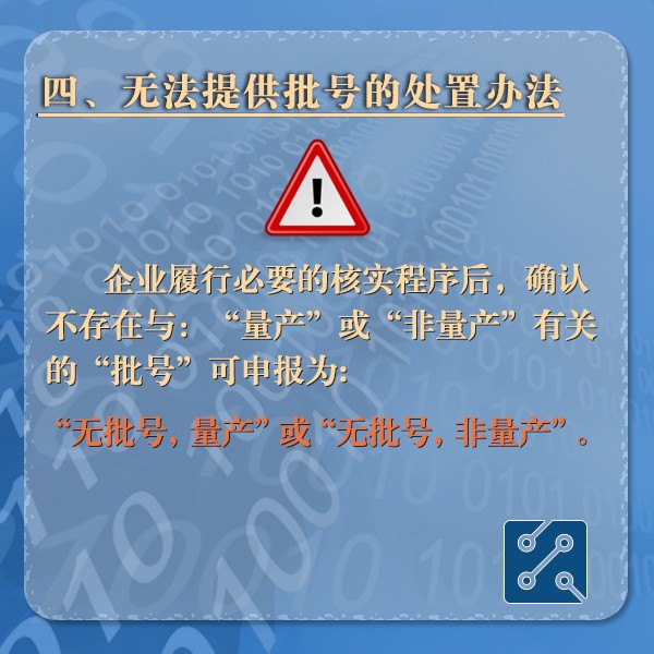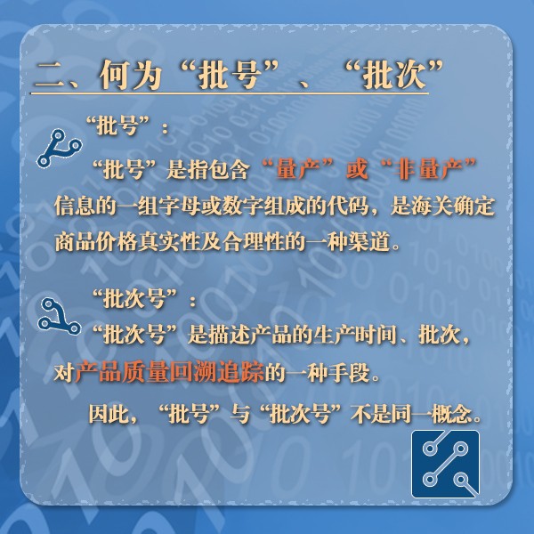 申报要素调整后,有很多小伙伴不清楚,此次集成电路的申报要素新增加的批号、批次应如何申报,这不,12360的小伙伴给出了答案:原来批号要确定产品是量产还是非量产,而批次则是产品质量回溯追踪的一种手段。具体要如何申报,赶紧看图吧↓↓↓
