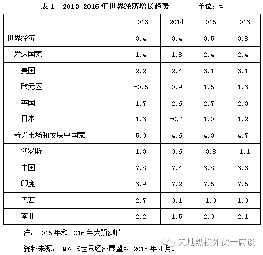 进入2015年,世界经济复苏趋势持续,但各地增长前景依旧不平衡。发达经济体中,劳动力市场、企业和消费稳步改善,石油价格下跌令美国经济增速仍处领先地位;欧元区和日本随着经济风险压力的缓解,与美国增速差距趋窄,但整体经济增长动力不足;石油、大宗商品价格持续下跌对新兴经济体国家俄罗斯和巴西造成严重伤害,新兴经济体整体经济增长放缓、金融风险上升。IMF预计,2015年世界经济将增长3.5%,高于上年0.1个百分点。发达经济体经济增长有望加快,预计增长2.4%。其中,美国经济将增长3.1%,比上年加快0.7个百分点;英国增长2.7%,高于上年0.1个百分点;欧元区增长率略高于上年,将达1.5%;日本仍将低速增长,增长率预计为1%。新兴经济体和发展中国家增长4.3%,低于2014年0.3个百分点,从中长期看,新兴经济体的潜在增速将从2008-2014年的6.5%下降至2015-2020年的5.2%。世界银行预计,2015年,发展中国家增长率为4.8%、东亚与太平洋地区放慢至6.7%(低于2014年6.9%的水平)、东欧与中亚地区回升到3%、拉美与加勒比地区平均增长2.6%左右。值得注意的是,尽管实体经济疲软,但一些国家的股市异常繁荣,经济基本面和金融市场走势出现背离。2015年以来,美国、欧洲、日本等地股市不断攀高,但实体经济却面临不同程度风险。原油价格走低以及央行实施的宽松货币政策对经济的影响有利有弊;美元汇率走高有助于改善美国的低通胀,但也会压制进口削弱经济,同时新兴经济体资本市场动荡加剧。