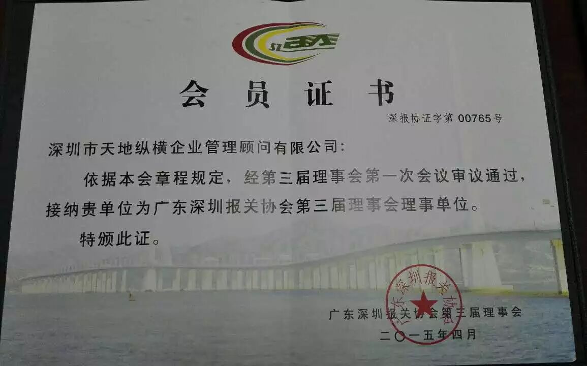 经深圳报关协会第三届理事会第一次会议审议,天地纵横成为深圳市报关协会理事单位。 作为深圳报关协会目前唯一 一家咨询顾问机构会员,未来天地纵横期待能够在涉外型企业管理咨询和技术服务方面给予协会成员更多的帮助。